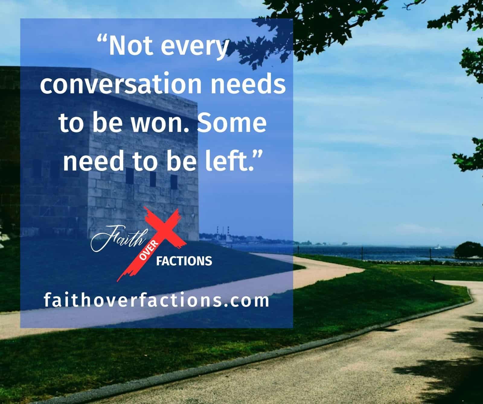 Redirect the conversation if possible. Ask about the person’s story rather than their stance. End with peace, not posture. “Don’t get involved in foolish, ignorant arguments that only start fights” (2 Timothy 2:23, NLT).
